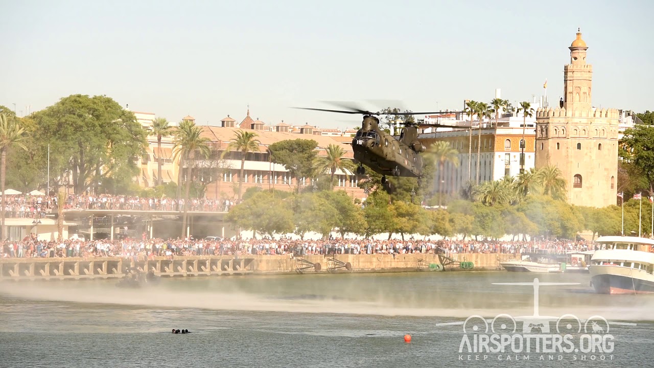 Comezaba así o desfile aéreo… e terrestre. Nel participaron 49 avións e 36 helicópteros, 177 vehículos e 34 motos. O acto discorreu durante dous quilómetros en paralelo ao río Guadalquivir, polo paseo de Cristóbal Colón e o paseo das Delicias, ata a ponte dos Remedios.