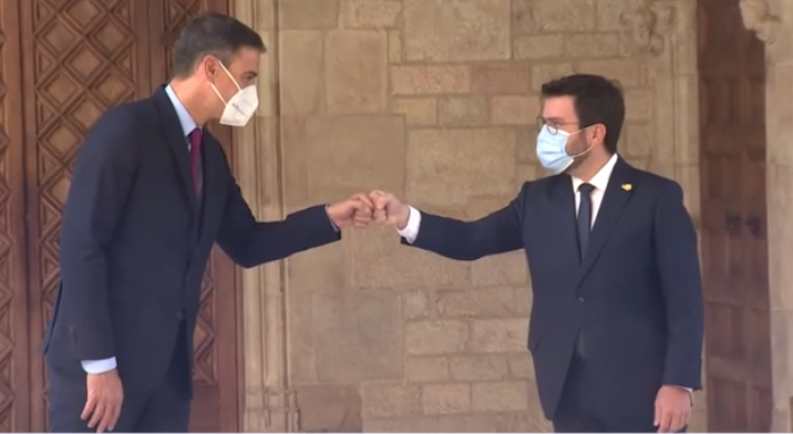 El jefe del Ejecutivo, Pedro Sánchez, se reunió en el Palacio de la Generalitat con el presidente regional de Cataluña Pere Aragonés.