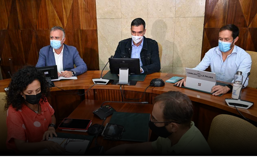 O presidente do Goberno, Pedro Sánchez, atrasou a súa viaxe a Nova York e viaxou á illa para incorporarse á reunión do Comité Director do Plan Especial de Protección ante Risco Volcánico de Canarias (PEVOLCA) e coñecer de primeira man a evolución da erupción. Sánchez, afirmou na Palma que a seguridade dos cidadáns ante a erupción volcánica está garantida e asegurou que calquera dano material producido polo volcán será reposto canto antes. O xefe do Executivo español compareciu ante os medios de comunicación, tras participar nunha reunión do Pevolca, acompañado polo presidente de Canarias, Anxo Víctor Torres, e polo presidente do Cabildo da Palma, Mariano Hernández Zapata.