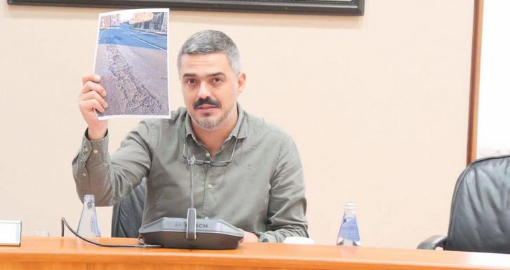 El diputado del BNG comenzó la defensa de su intervención mostrando al resto de diputados de la Comisión 2.ª fotografías del pésimo estado en el que se encuentra la carretera, e incluso hizo que se escuchase una grabación en directo de la TVG en un momento en el que justo se produjo el reventón de una rueda por culpa de los baches que hay en la carretera.