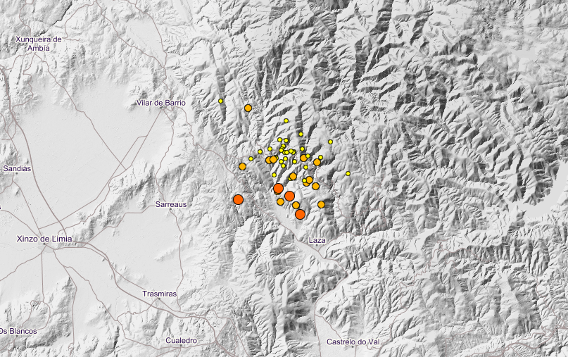 En los puntos más próximos al epicentro de Laza se sintió con intensidad cuatro, moderada y perceptible dentro de los edificios. Después de este aún hubo más de una decena en la misma zona, ya menores, de 2,5, o de 2,9. Ourense lleva así varios días, viviendo un fenómeno que llaman enjambre sísmico, con más de medio ciento de temblores, casi una veintena en Laza en las últimas 24 horas.