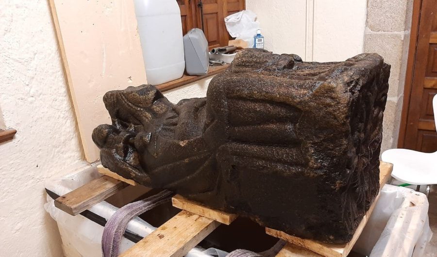 Rematou a fase inicial de limpeza da escultura pétrea da Virxe que foi descuberta no río Sar, en Santiago de Compostela, o pasado mes de xuño. Así, o equipo de técnicos da Consellería de Cultura, Educación e Universidade traballa neste primeiro paso nas fendas que se atopan na cabeza do anxo e na eliminación das sustancias depositadas na superficie da peza, como unha pequena pedra encaixada no manto da Virxe.