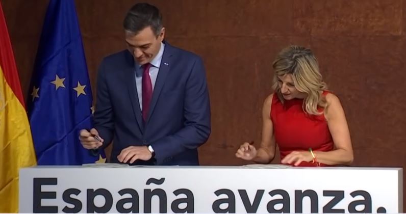 Sánchez compareceu xunto á vicepresidenta segunda en funcións e líder de Sumar, Yolanda Díaz, para presentar o pacto de goberno conxunto con medidas no ámbito social e laboral, entre as que destacan a redución da xornada laboral de 40 a 37,5 horas sen rebaixa salarial, a subida do salario mínimo interprofesional, a ampliación dos permisos por nacemento e o reforzo do sistema público de saúde para reducir listas de espera, entre outras. Ambos o definiron como un «proxecto de país» e a guía para avanzar en dereitos.