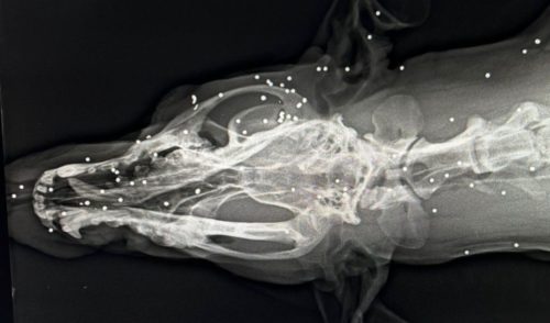 Así lo explica Mar Carracedo, la veterinaria que la atendió: “Tiene perdigones cómo doscientos en todo lo que es cabeza, extremidades delanteras y cuerpo, por la trayectoria se ve que el disparo fue de cara a la perra”.