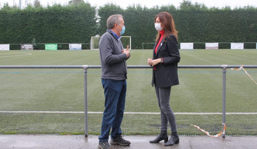 La directora general de Administración Local, Natalia Prieto, visitó las mejoras realizadas en el pabellón municipal y en el campo de fútbol del ayuntamiento de Touro, apoyadas a través de la convocatoria de este año de la Orden de infraestructuras de uso público. Las ayudas de la Xunta contribuiron a reparar las filtraciones que se producen en el pabellón a través de la cubierta, por lo que se substituyeron los elementos en mal estado y se renovaron los canalones y bajantes para permitir la evacuación del agua. Además, en el campo de fútbol se demolió una edificación auxiliar que se reconstruye ampliándola para dotar de mayor superficie al recinto. Natalia Prieto explicó que son actuaciones que redundan en el bienestar de los ciudadanos y que a las entidades locales les sería más complicado ejecutar en solitario.