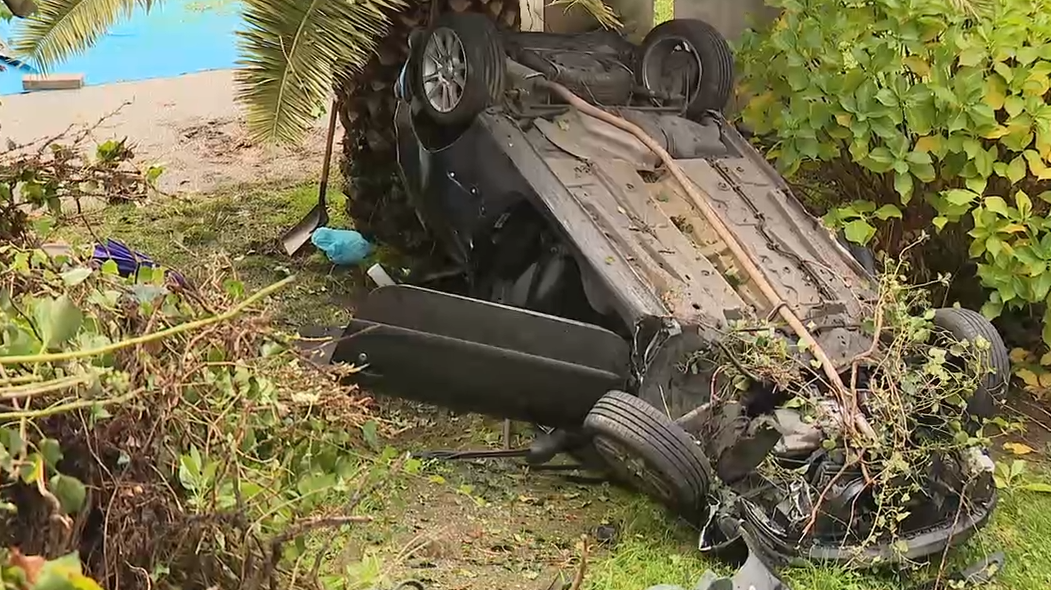 Este venres un coche caeu dunha vía a outra con catro ocupantes a bordo na parroquia compostelana de Vidán. Unha das vítimas precisou da intervención dos Bombeiros de Santiago para poder saír do vehículo. O incidente ocorreu preto das cinco da tarde na Avenida Mestra Victoria Míguez, e foi un particular quen alertou ao 112 do suceso. O coche acabou literalmente estampado no xardín dunha casa, bateu coa varanda e caeu de cú contra unha palmeira. Xusto nese momento a propietaria da vivenda aparcaba o seu vehículo na casa e escoitou o ruido do impacto. No operativo tamén interviñeron os profesionais sanitarios do 061 e axentes da Policía Local.
