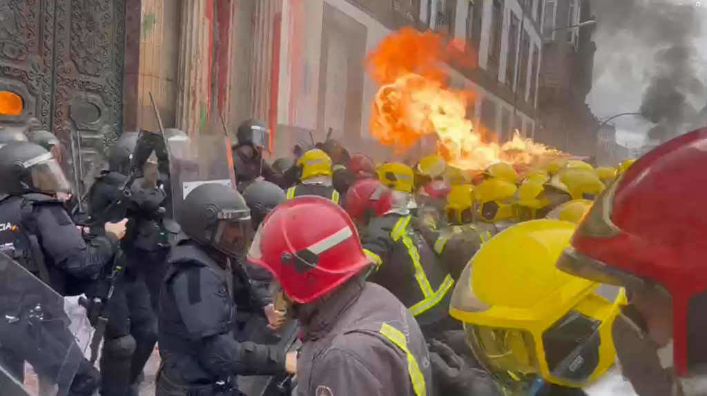 Los bomberos comarcales de la Galicia, en huelga desde junio y que la semana pasada decidieron dar libertad a los trabajadores para secundar o no el paro, continúan su calendario de movilizaciones este lunes 23 de octubre con una concentración ante la Diputación de Ourense. Más de 200 efectivos participaron en esta nueva protesta, entre gritos de “dimisión”, lanzando pintura a la fachada del edificio y quemando neumáticos frente al mismo, en el centro de la calle Progreso. Una manifestación que llega después de que la pasada semana se manifestaran ante la Diputación de Pontevedra para demandar mejores condiciones. En la movilización de Ourense hubo momentos de tensión tras una carga policial que dejó varios bomberos heridos.