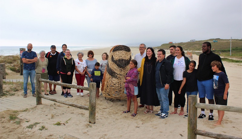 El alumnado del taller de cestería en el que se materializó, el concejal de Medio Ambiente y el alcalde asistieron a su instalación en la zona de la Explanada