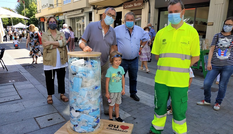 Para visibilizar a magnitude do problema e facer reflexionar á poboación, este xoves colocouse na rúa Coruña un gran recipiente transparente coas luvas e as máscaras recollidas en dous días nas rúas carballesas.