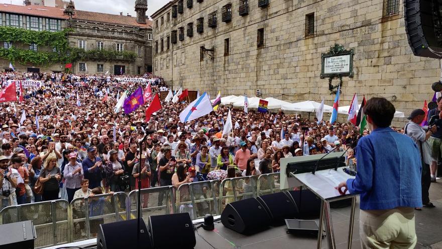 Pasado el mediodía de este martes 25 de julio, miles de personas se movilizaban en Compostela con el objetivo en el horizonte de un «cambio político» y de «ciclo» en las próximas elecciones autonómicas. Bajo el lema «Imos a máis» la concentración de personas arrancó en la Alameda, en una jornada en la que la portavoz nacional del Bloque Nacionalista Galego, Ana Pontón, reivindicó el «orgullo» de «ser una nación» y «un país con muchísimo futuro», al tiempo que subrayó que las puertas del Bloque «están abiertas» para «seguir ensanchando» a la formación. Pontón destacó que el 23 de julio «quedó claro que hubo una derrota de ese bloque de la derecha», por lo que el BNG va a trabajar por un Gobierno «alternativo que amplíe derechos y libertades, pero también que cumpla con Galicia».