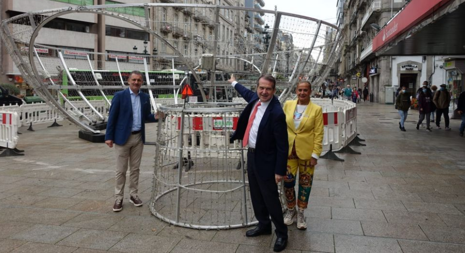 “Vamos a tener la mejor Navidad que hubo nunca; vamos a tener una afluencia excepcional de gente porque hay una enorme expectativa con la Navidad de Vigo, que ya se confirmó como de ámbito planetario”, señaló el regidor, que recordó que las fiestas de este año supondrán un ahorro de energía del 14,6% con el aplazamiento del encendido media hora y con el adelanto, también media hora ,del apagado diario de la iluminación. Así, la ciudad supera los requisitos y la solidaridad que pide la Unión Europea (un ahorro del 7,5%). “En Vigo haremos el doble”. El Ayuntamiento inició ya el montaje de la Bola de Navidad de Urzáiz, que quedó finalizada este lunes por la noche, después de 24 horas de trabajo. Tiene 12 metros de diámetro y 8 toneladas de peso, siendo “una de las atracciones notables navideñas”.