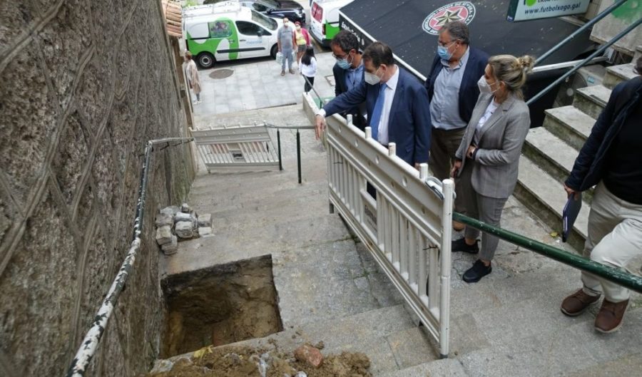 El alcalde de Vigo, Abel Caballero, visitó el inicio de los trabajos en la calle Talude para la construcción de una nueva escalera mecánica dentro del programa Vigo Vertical, con financiación de fondos europeos Feder de la estrategia Edusi. El regidor, que realizó un recorrido por las viejas escaleras, donde ya comenzaron las catas técnicas para el desenrollo de la actuación, señaló que el desnivel de la zona es de 8 metros, con una pendiente del 45%. “Son muy verticales y complejas, por lo que construiremos una escalera mecánica y humanizaremos la calle y el entorno, dando también acceso al Colegio Mariano”, señaló. En los últimos días se llevaron a cabo tres catas para estudiar a fondo el terreno y decidir el tipo de firme que existe en la zona. “Las escaleras están muy deterioradas y vamos a cambiarlas enteras, además de desenrollar dos proyectos paralelos”, apuntó.