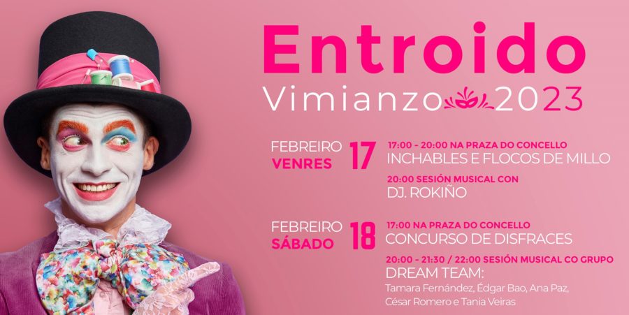 El sábado 18 será el día grande con el concurso de disfraces a partir de las 17:00 horas. Tendrá lugar en la plaza del Ayuntamiento donde, de 20:00 a 22:00 horas aproximadamente, habrá actuaciones musicales a cargo del Dream Team formado por los artistas Tamara Fernández, Ana Paz y César Romero (integrantes de la orquesta Cinema), Tania Veiras y Édgar Bao (La Voz Kids). Además, a las 21:30 horas el vimiancés DJ Rokiño presentará so segundo tema.