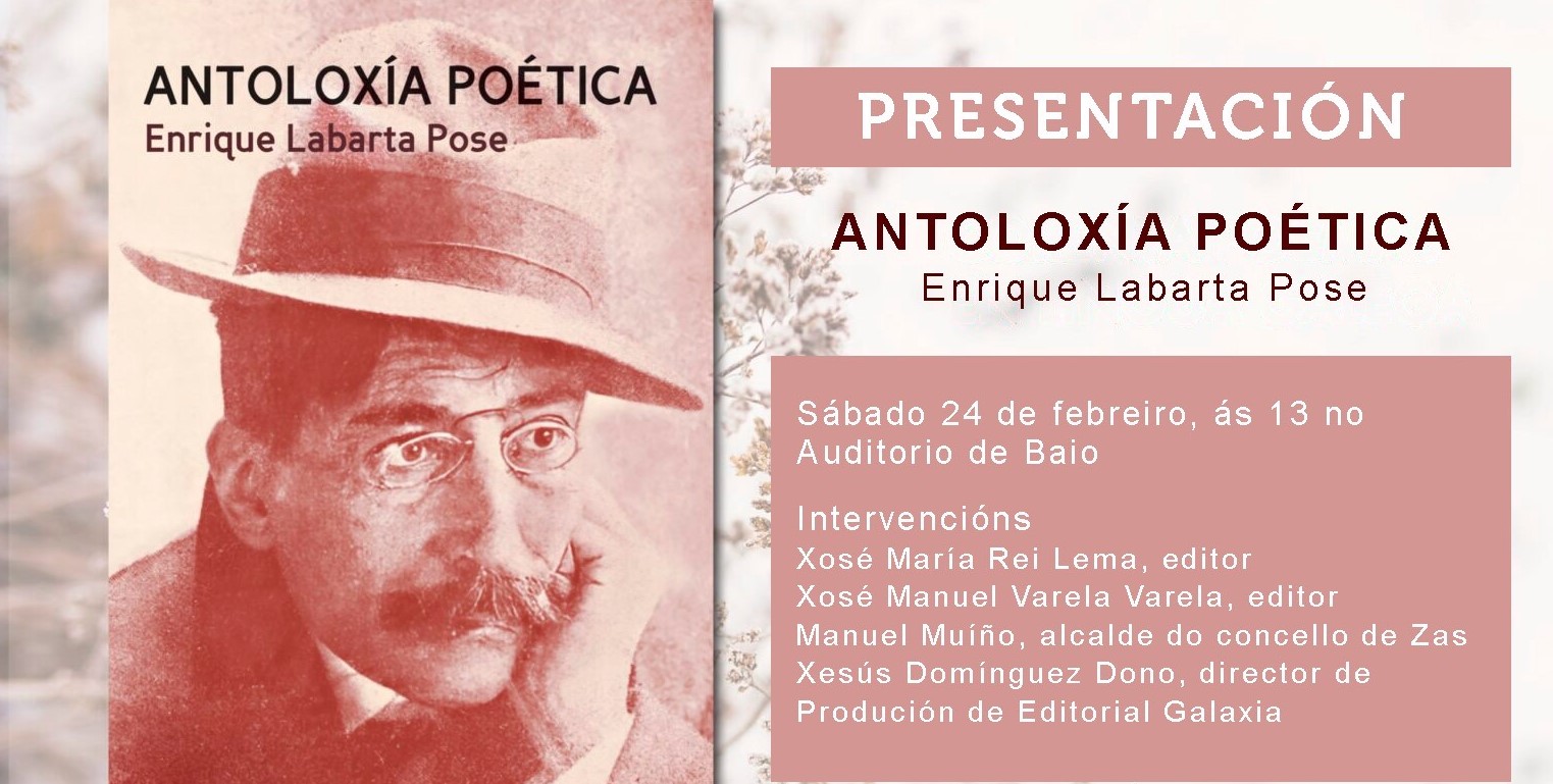 O sábado 24 de febreiro, ás 13:00 horas, terá lugar no Auditorio de Baio a presentación da “Antoloxía Poética” de Enrique Labarta Pose, editada por Xosé María Rei Lema e Xosé Manuel Varela Varela e publicada pola Editorial Galaxia en colaboración co Concello de Zas.
